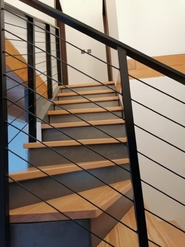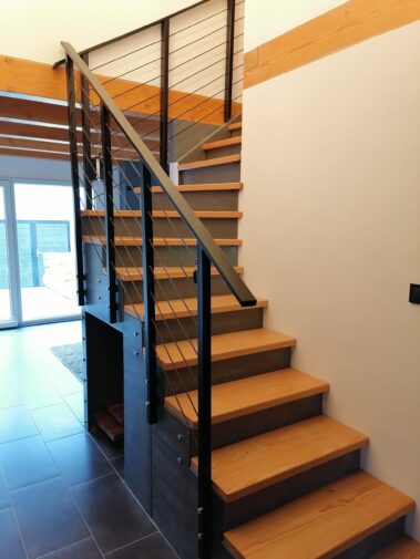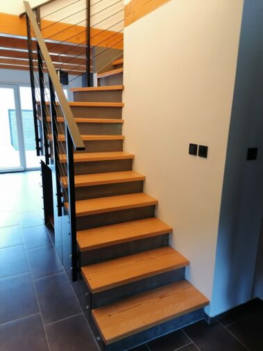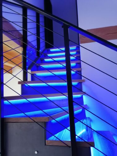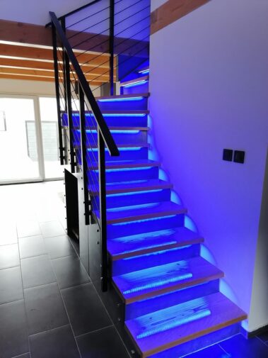 Kompletní realizace schodů od nosné konstrukce po dřevěné obložení a podsvícení.
