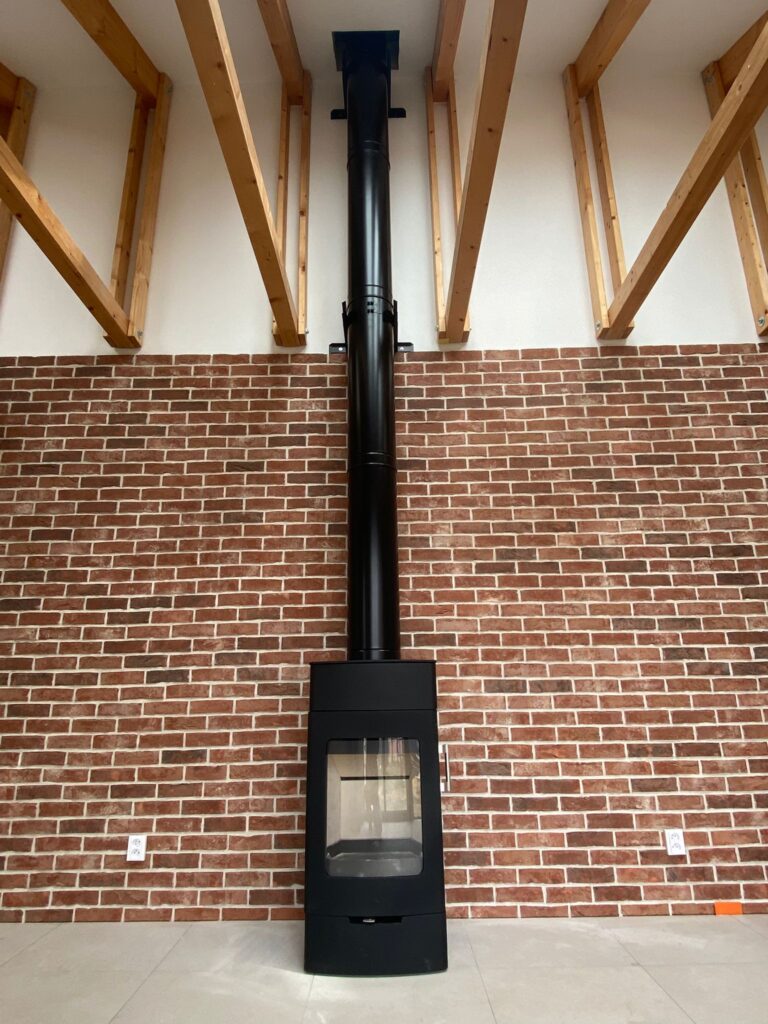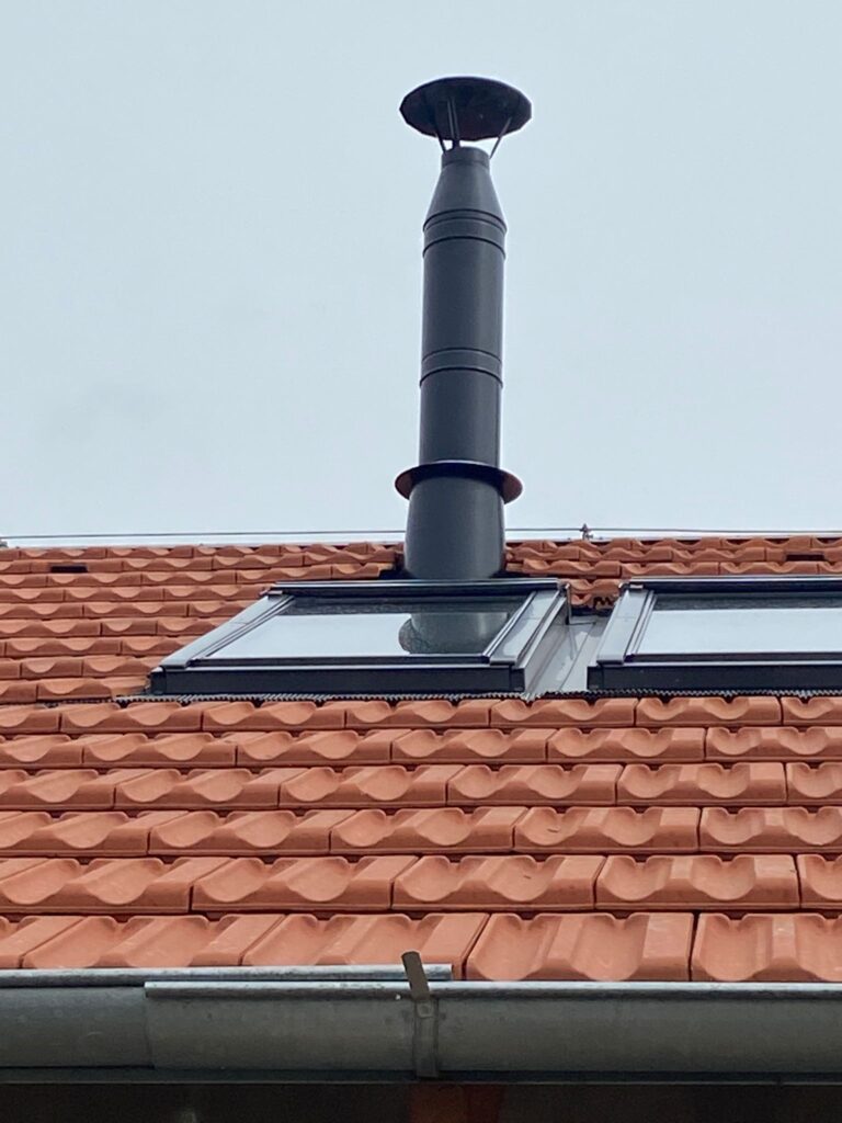 Komínový systém je navržen jako třívrstvý nerezový komín s odolností vůči povětrnostním vlivům a stabilním tahem. Provedení respektuje požadavky na bezpečnost provozu i estetiku interiéru.
